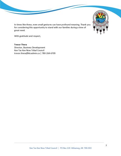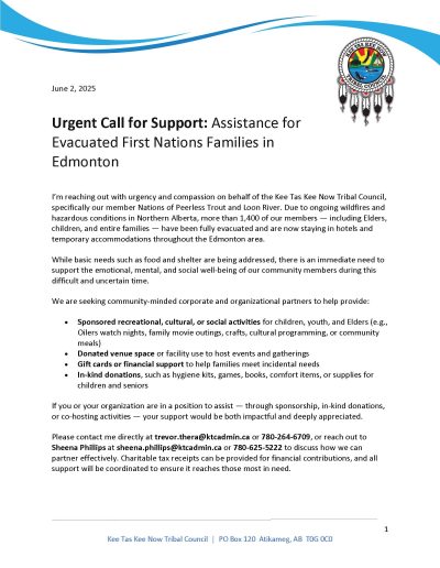 The Kee Tas Kee Now Tribal Council is asking for assistance from businesses, organizations, and community members. Support can include: